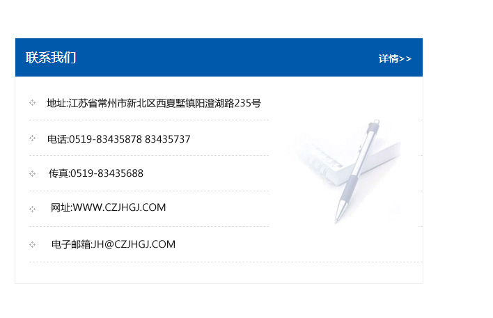 地址:常州市新北區友邦商務大廈1幢16、17層  電話:0519-85101652  傳真:0519-85112595  郵編:213022  網址:www.cz-jiayue_cn.xnhtmy.com  郵箱:xiajifengaa@163.com